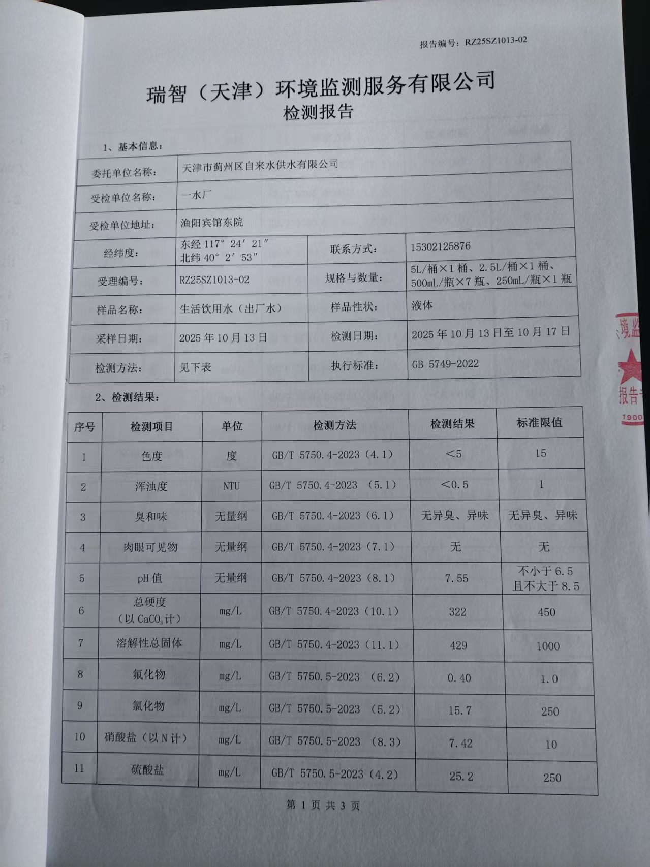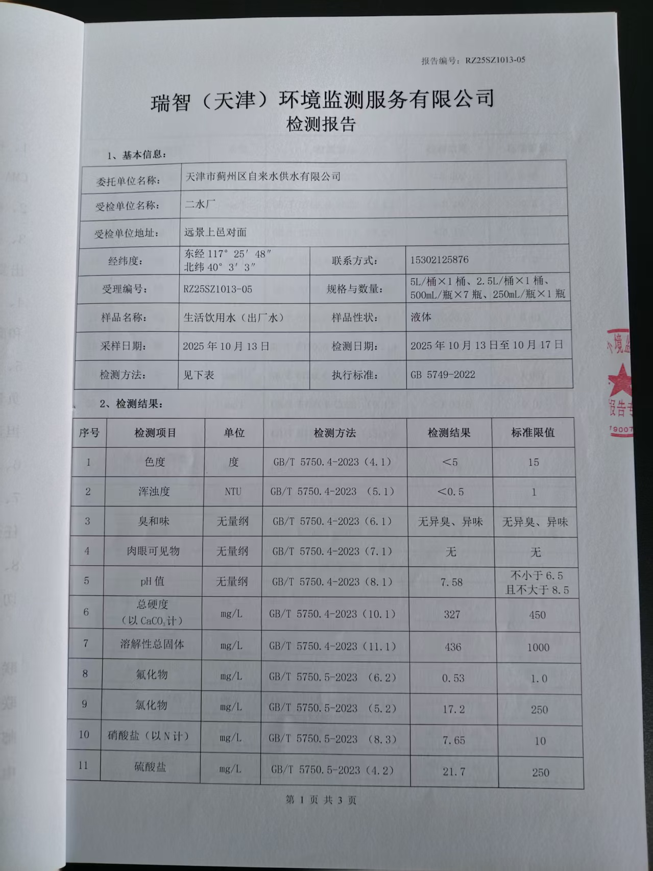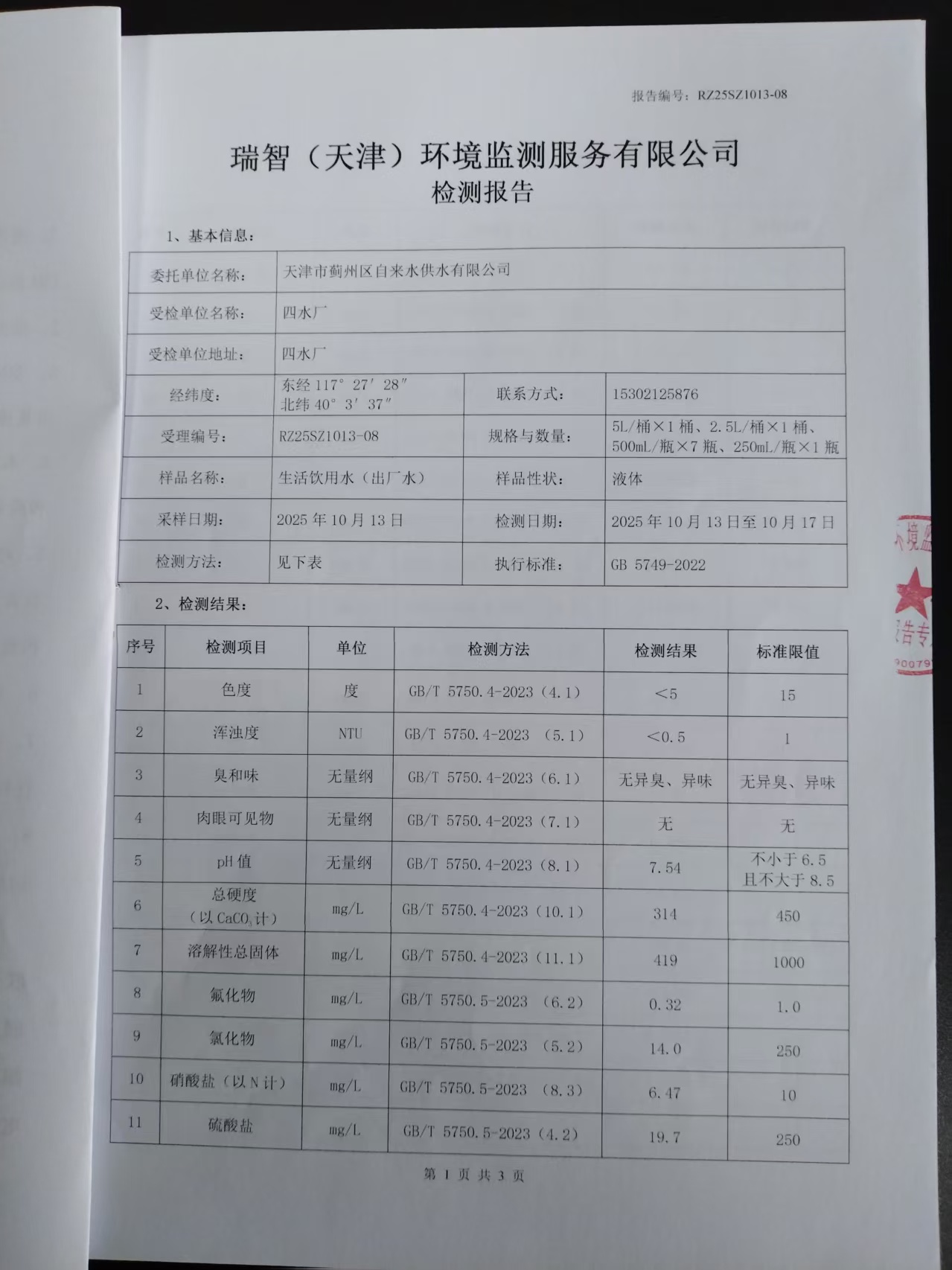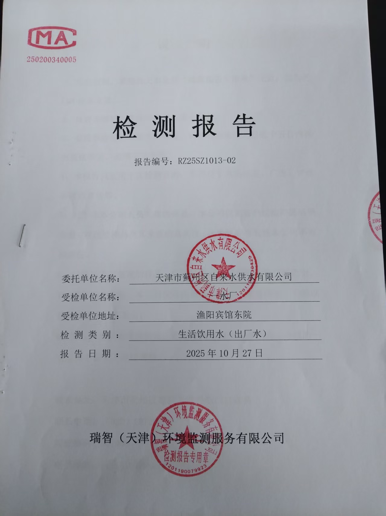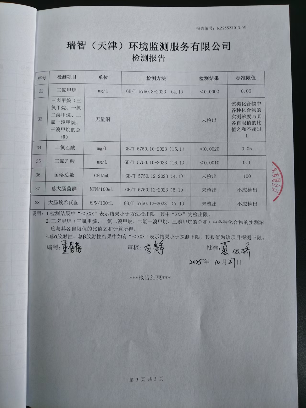 2025年10月份水質檢測報告